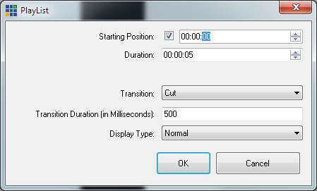 Starting Position: If the PlayList item is a video clip, a starting position can be set here. If the Starting Position checkbox is not checked the item will start playing from the current position.