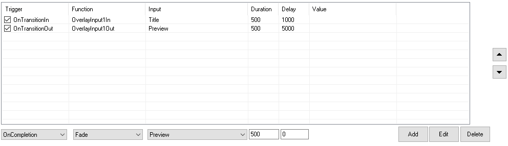 In the example above the Title 1 input is turned on as an overlay 1 second after the current input begins a transition. After 5 seconds the overlay is turned off again.