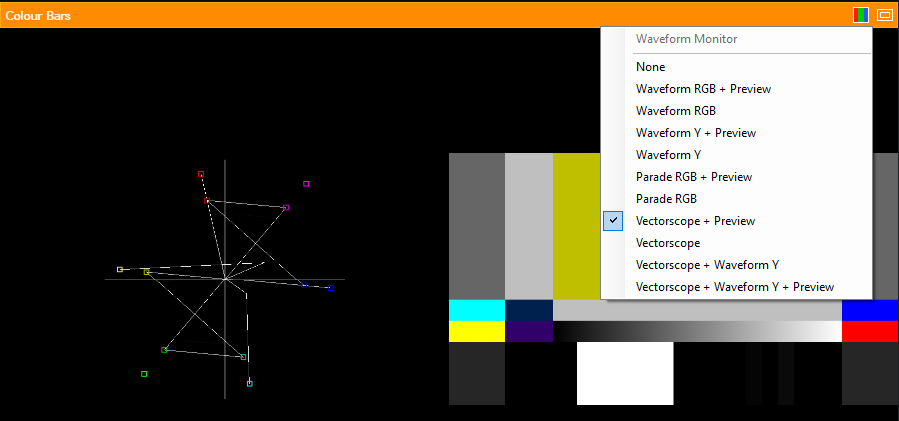 The professional waveform monitor can be turned on within the Preview window and the Input settings window by clicking the colour bar icon as shown below.