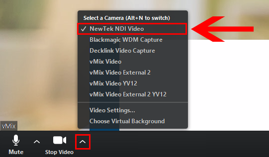 Next we will configure the Zoom video source. Select the arrow next to the camera icon in the bottom left corner. Then choose the Newtek NDI Video option.