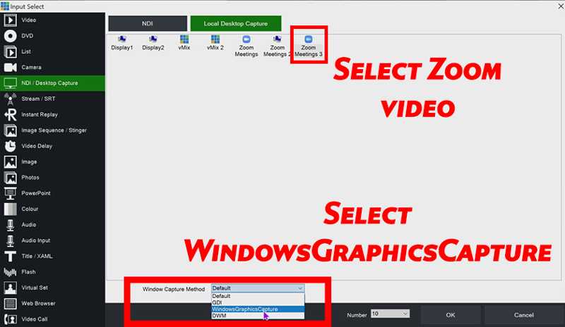 Once your guests have joined your Zoom meeting, we can now add them into vMix. To add the video, select the Add Input button from the bottom left corner. Then select the NDI / Desktop Capture tab. Choose the Local Desktop Capture button from the top. From here, we need to select the Zoom window displaying your video, which is usually the last number. Then you will need to select WindowsGraphicsCapture from the Windows Capture Method Dropdown. Then Click OK.