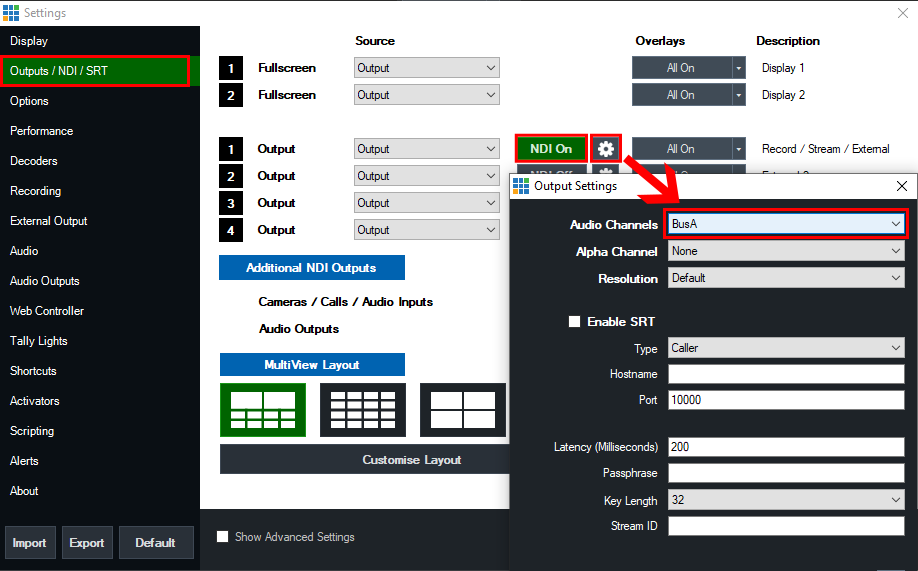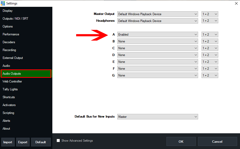 Next go to the Audio Outputs tab and set the Bus A option to Enabled.