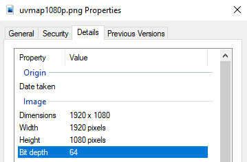To check it has successfully saved as a 64 bit depth PNG file, go to the file in Windows. Select Properties, then select the Details tab. It should say 64 next to Bit Depth.