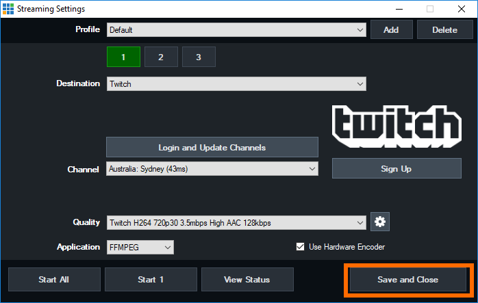 When you are ready to stream click the Start button or Save and Close. You can choose to start your stream by clicking the Stream button in vMix.