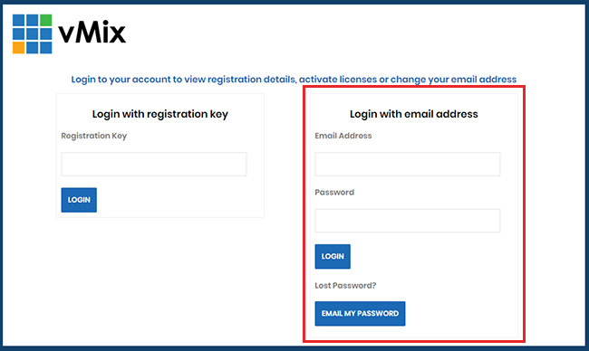 2. Login to your vMix Account using the second box titled "Login with email address" and enter in the same Email Address used to registered the key to. This will be the email address entered when purchasing the key unless the email has been changed via the vMix Account since purchase.